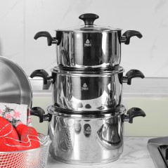 Batterie de Cuisine en Inox 18/10 - 43 Pièces Noir - Falez de haute qualité, conçue pour une cuisson saine et efficace. Dotée d’un fond à trois couches assurant une excellente répartition de la chaleur, cette batterie est adaptée aux plaques à induction, gaz, vitrocéramique et halogène. Sa conception robuste garantit une longue durée de vie, tout en préservant les nutriments et saveurs des aliments grâce à une cuisson avec peu d’eau et de matières grasses. Grâce à son acier inoxydable de qualité, les poignées restent froides et la batterie ne nécessite pas d'ajout excessif de sel, offrant ainsi une meilleure conservation des aliments
