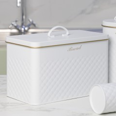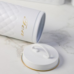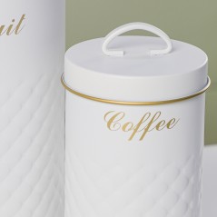 Donnez une touche chic et ordonnée à votre cuisine avec ce set de 5 boîtes en métal blanc. Chaque boîte est dédiée à un usage précis : pain, sucre, biscuits, café et thé. Leur design élégant avec motifs en relief et inscriptions dorées apporte une note raffinée tout en garantissant une conservation optimale de vos aliments.