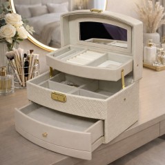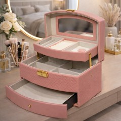 Apportez une touche d’élégance et d’organisation à votre espace beauté avec ce coffret à bijoux haut de gamme couleur vert sauge. Son design raffiné, ses finitions dorées et son intérieur en velours doux en font un accessoire indispensable pour ranger et protéger vos bijoux avec style. Grâce à son miroir intégré, ses compartiments modulables et ses tiroirs spacieux, ce coffret permet de garder tous vos bijoux bien visibles, accessibles et parfaitement protégés.