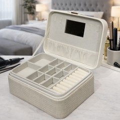 Ce coffret à bijoux compact est conçu pour offrir un rangement pratique et élégant à vos bijoux du quotidien. Son format facile à transporter, son intérieur en velours doux et son miroir intégré permettent d’organiser bagues, boucles d’oreilles, colliers et bracelets en toute sécurité. Son design sobre et moderne s’intègre parfaitement sur une coiffeuse, une étagère ou dans une valise lors de vos déplacements.