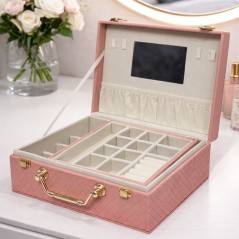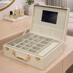 Ce coffret à bijoux élégant est conçu pour offrir un rangement organisé et sécurisé à tous vos accessoires. Doté d’un miroir intégré et de compartiments bien répartis, il permet de ranger bagues, colliers, bracelets et montres en toute simplicité. Sa finition en simili cuir texturé et sa poignée métallique lui donnent un style chic et pratique, idéal pour un usage à la maison ou lors de vos déplacements.