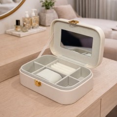 Ce coffret à bijoux compact est idéal pour organiser vos accessoires essentiels tout en gardant un format pratique et élégant. Son miroir intégré facilite l’essayage, tandis que ses compartiments bien agencés permettent de ranger bagues, boucles d’oreilles, colliers et petits bijoux en toute sécurité. Son design sobre en fait un excellent choix pour la maison ou pour les déplacements.