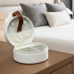 Ce coffret à bijoux rond est idéal pour ranger vos bijoux essentiels avec élégance et simplicité. Son format compact le rend parfait pour une utilisation quotidienne ou pour l’emporter en voyage. L’intérieur en velours doux protège efficacement vos bagues et petits accessoires, tandis que son design épuré s’intègre facilement dans une coiffeuse ou un sac.