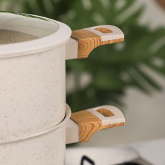 • Poignées : Ergonomiques effet bois, résistantes à la chaleur